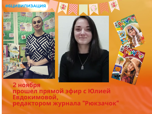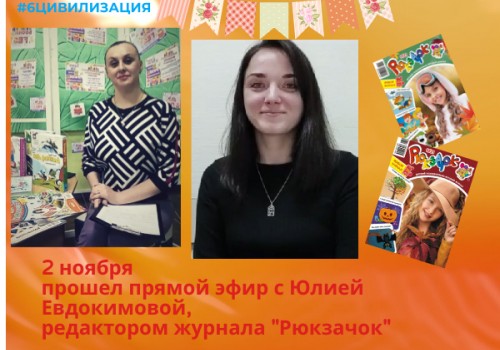 Редактор детского журнала "Рюкзачок" Юлия Евдокимова 2 ноября приняла участие в прямом эфире Детского книжного фестиваля "Шестая цивилизация".