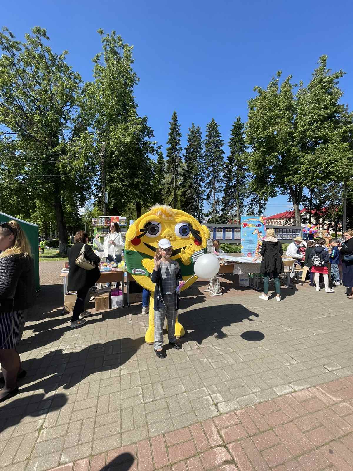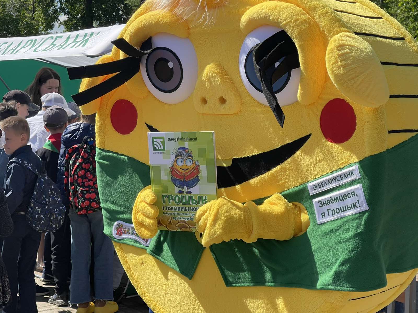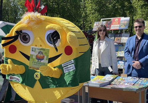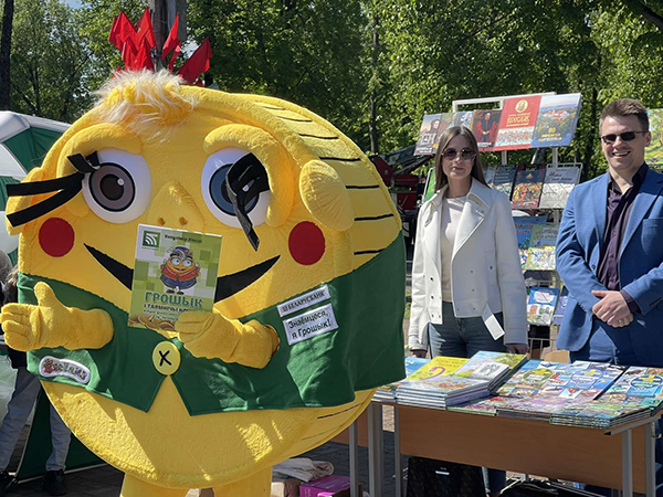 Наш стенд легко найти по яркому талисману — Грошику, с которым очень нравится фотографироваться детям. Мы выпустили уже 5-е издание книги В. С. Липского «Грошык i таямнiчы кошык», посвященной азбуке финансовой грамотности для детей.