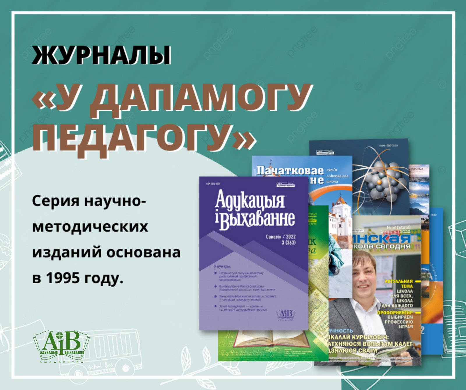 Серия «У дапамогу педагогу» была основана в 1995 году. Сегодня в серии выходят 14 научно-методических журналов: «Адукацыя і выхаванне», «Беларуская мова і літаратура», «Біялогія і хімія», «Геаграфія», «Гісторыя і грамадазнаўства», «Замежныя мовы», «Матэматыка», «Мастацтва і школа», «Минская школа сегодня», «Пачатковае навучанне: сям’я, дзіцячы сад, школа», «Профессиональное образование», «Русский язык и литература», «Спецыяльная адукацыя» и «Фізіка».