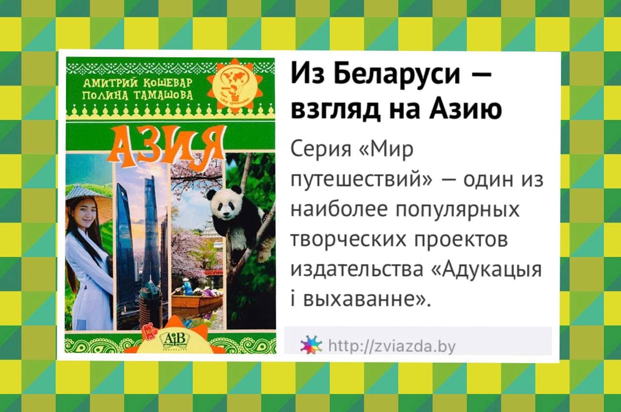 «Новая книга, вышедшая в этой серии, — сборник научно-популярных очерков Дмитрия КОШЕВАРА и Полины ТАМАШОВОЙ «Азия». Под одной обложкой собраны повествования о таких странах, как Япония, Узбекистан, Шри-Ланка, Таиланд, Вьетнам, Монголия, Китай, Сингапур, Камбоджа, Индия, Иран, Южная Корея. А предваряет лаконичные и вместе с тем богатые на фактический материал истории об этих государствах очерк общего характера — «Здравствуй, Азия!»