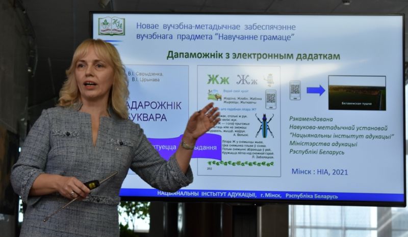 — Сёння мы з гонарам прэзентуем вучэбны дапаможнік «Буквар» для ўстаноў агульнай сярэдняй адукацыі з беларускай мовай навучання, — сказала В. Гинчук. — За ім стаіць праца вялікай колькасці людзей, супрацоўнікаў Нацыянальнага інстытута адукацыі і выдавецкага цэнтра. Мы вельмі ўдзячны ўсім, хто працаваў над ім. Хочацца сказаць вялікія словы падзякі Нацыянальнай кінастудыі «Беларусьфільм», якая стварыла мультфільмы па кожнай літары беларускага алфавіту і дала нам магчымасць зрабіць спасылкі на іх у новым вучэбным дапаможніку.